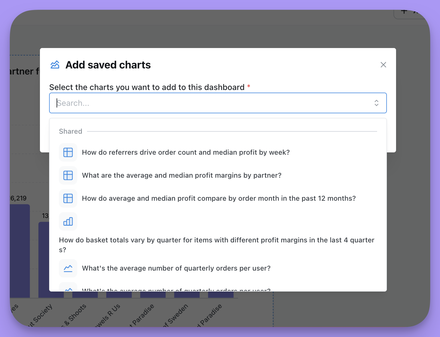 You can add an existing chart to your dashboard by clicking “Add tile” and then “Saved chart”. Clicking any chart will add it at the bottom of your dashboard.
