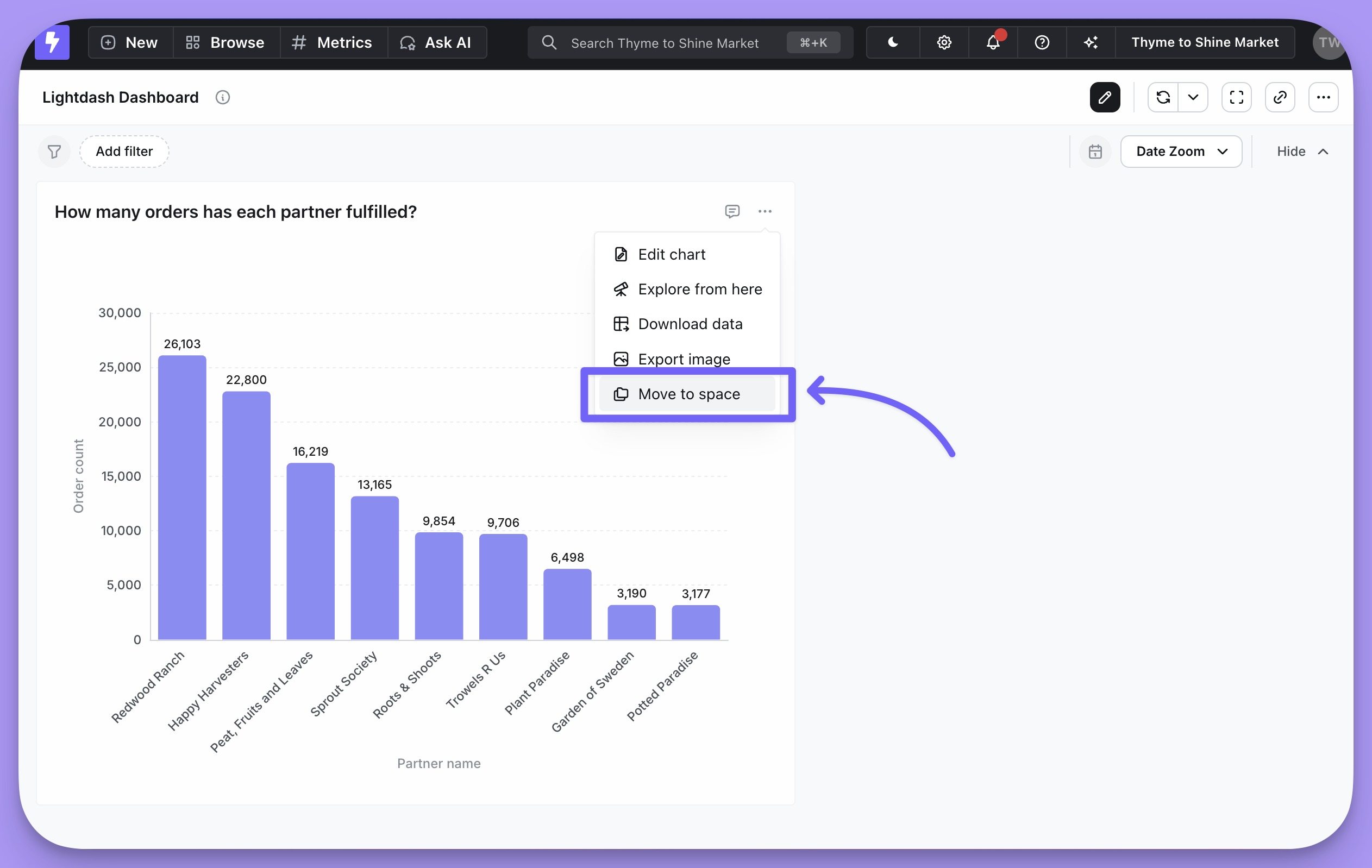 Note: These charts can’t be used in other dashboards and won’t be shown in the global search or in any space. If you want to make these charts reusable in other dashboards, you can detatch them from the dashboard and save them to a space so they’re permanent using the move to space option from the chart’s three-dot-menu.