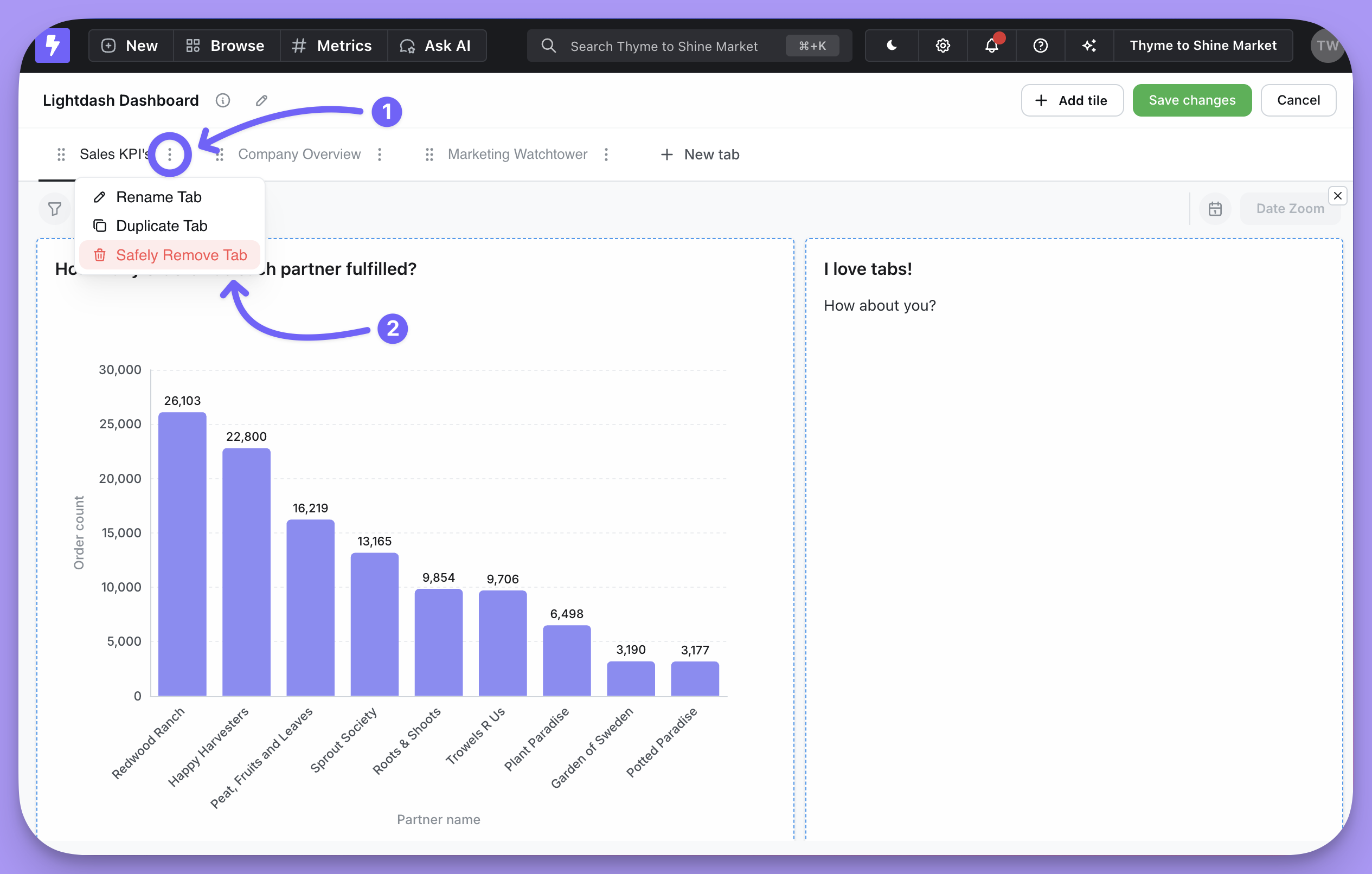 To edit a tab, click on the edit icon to the right of your tab name while in dashboard edit mode. You can either rename or remove the tab from your dashboard.