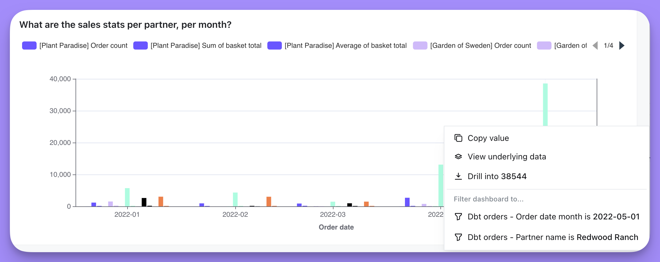I have a chart with Sum of basket total (a Metric) per Partner, per month. As you can see, there’s a high spike in sales for one of the partners in the month of May. I want to understand why this spike happened. To do this, I click on the data point in my chart, then click Drill into in the action menu: