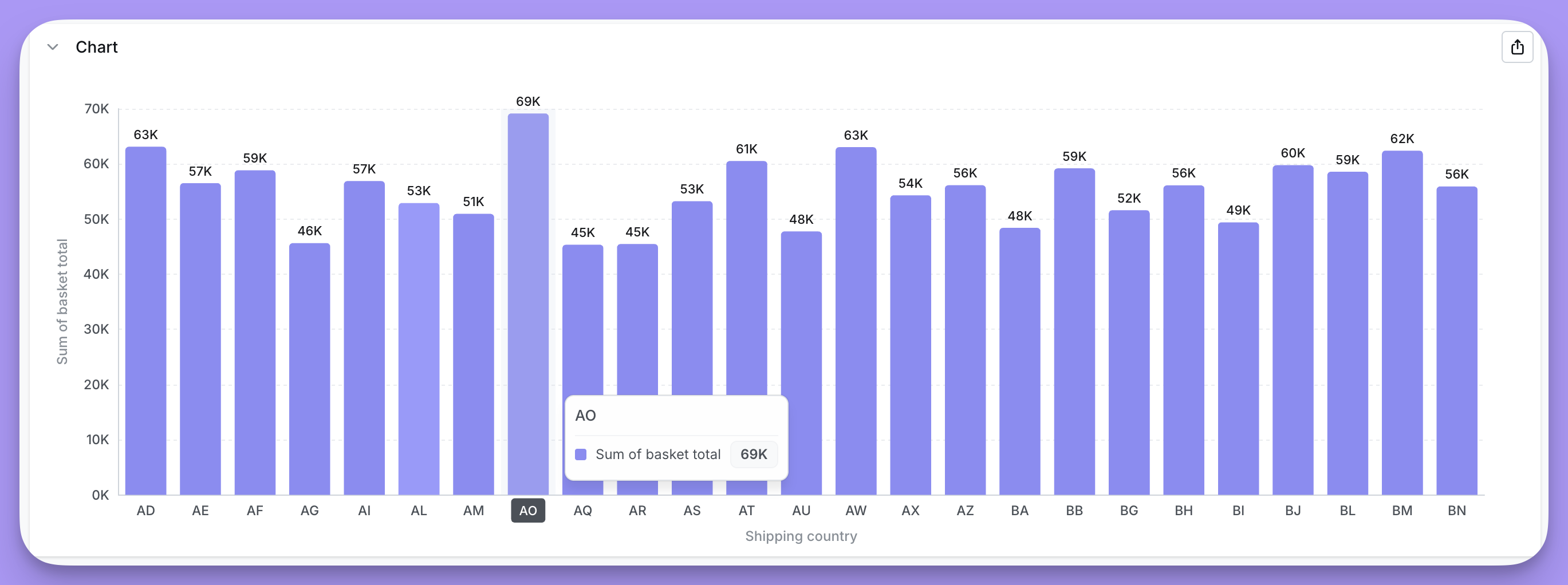 Once I’ve selected the Dimension I want to group by, I click Open in new tab and see a chart with my Metric, grouped by Shipping country. Now I can uncover where this spike in sales is coming from