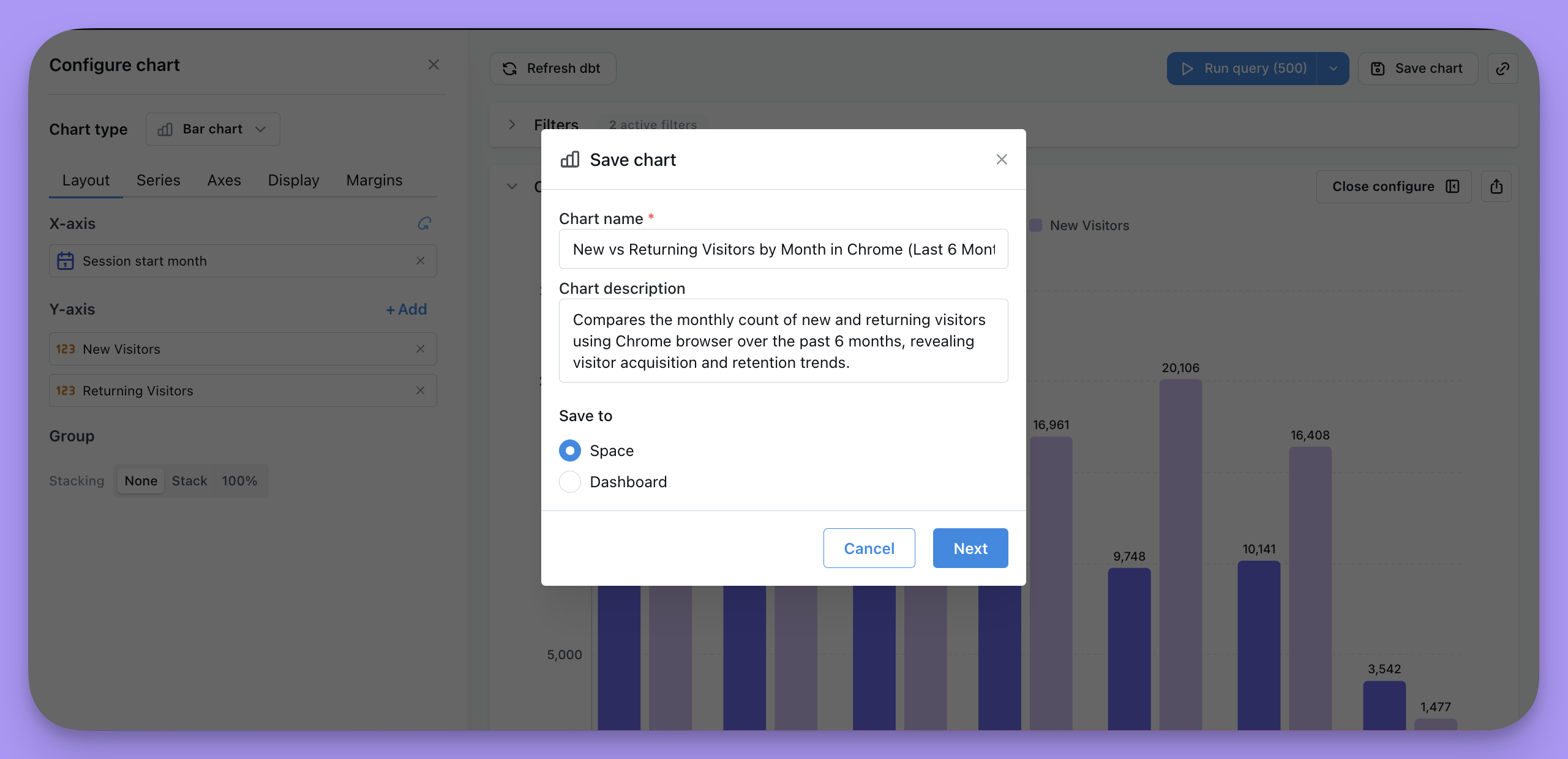 To save a chart, click the Save chart button at the top of the page, then give your chart a useful name and description. You’ll have the option to save the chart to a Dashboard or a Space. Once you save a chart, it unlocks these useful features: