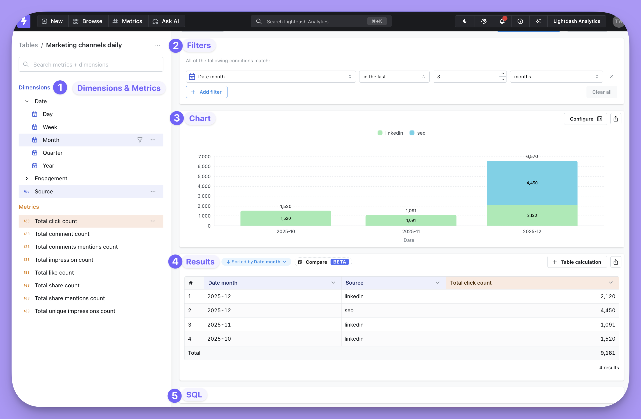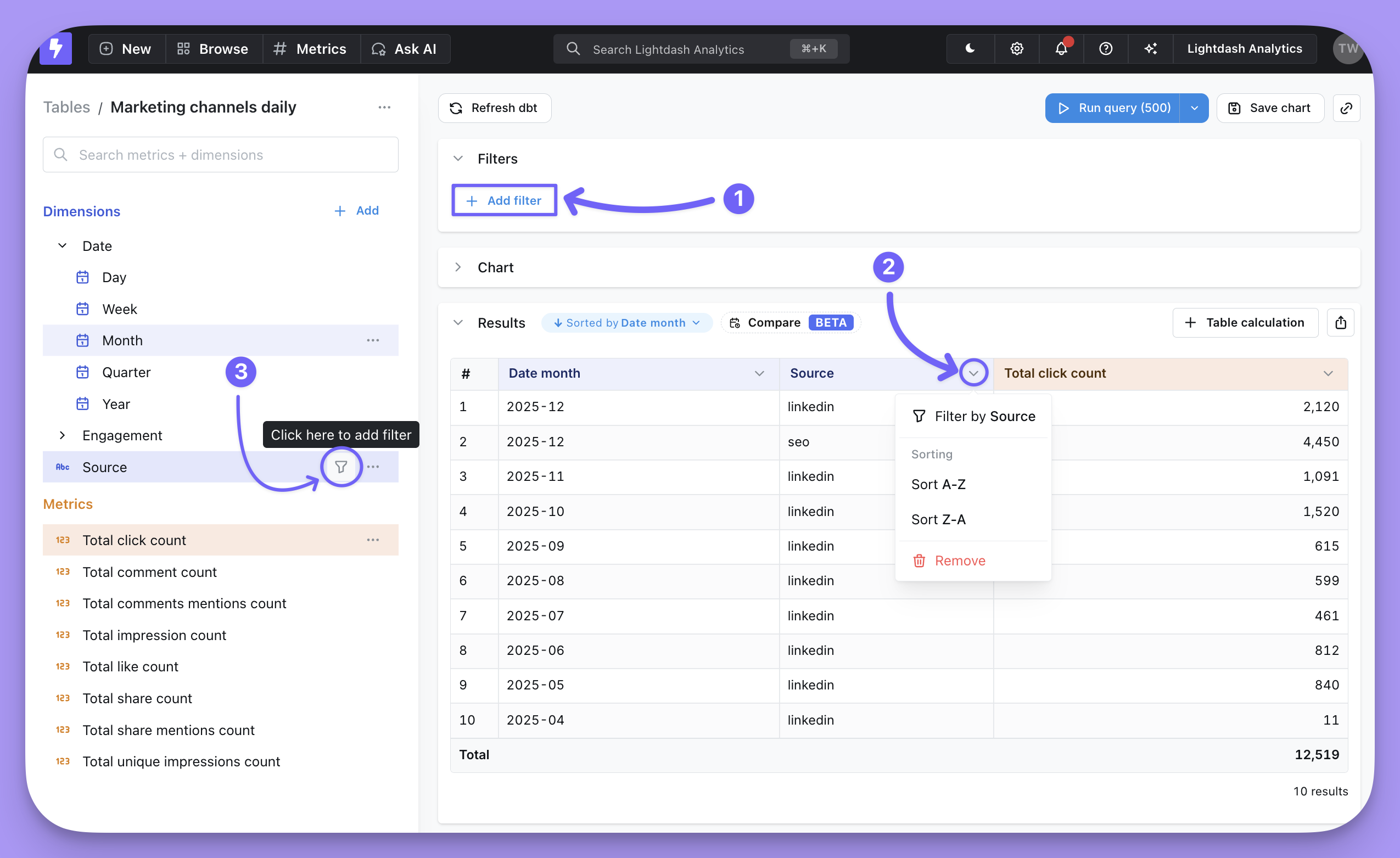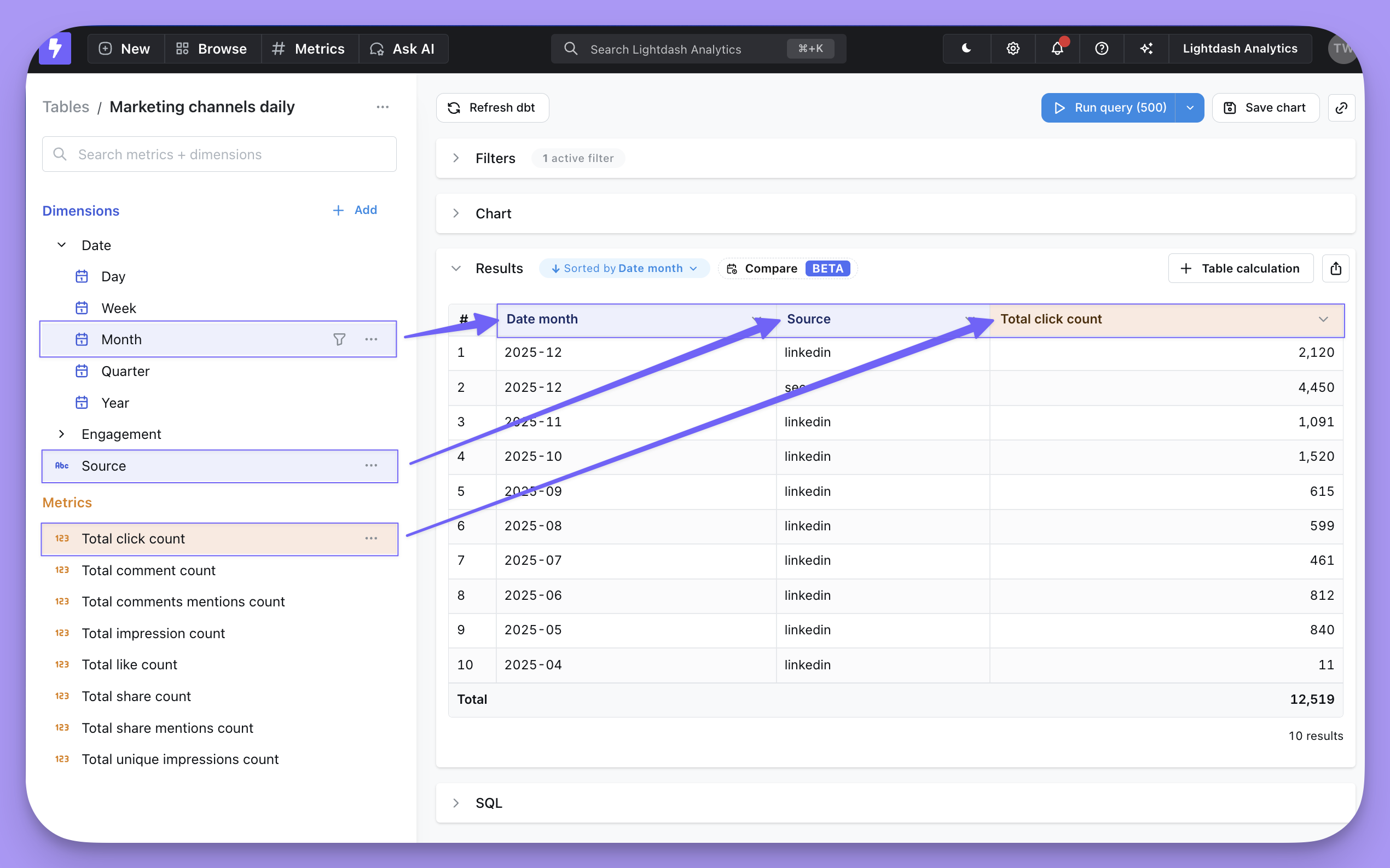 For example, if I wanted to know the “number of orders per month split by partner”, I’d select the Order count metric, the Order month dimension, and the Partner name dimension, to split by partner.