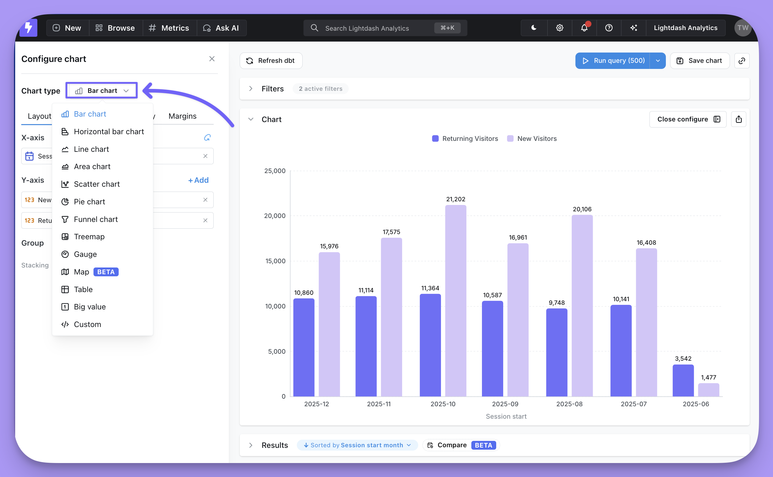Once the query runs, your data will appear in the results table. You can then open the Chart section and choose a chart type. You can read more about all the chart types and configurations here.