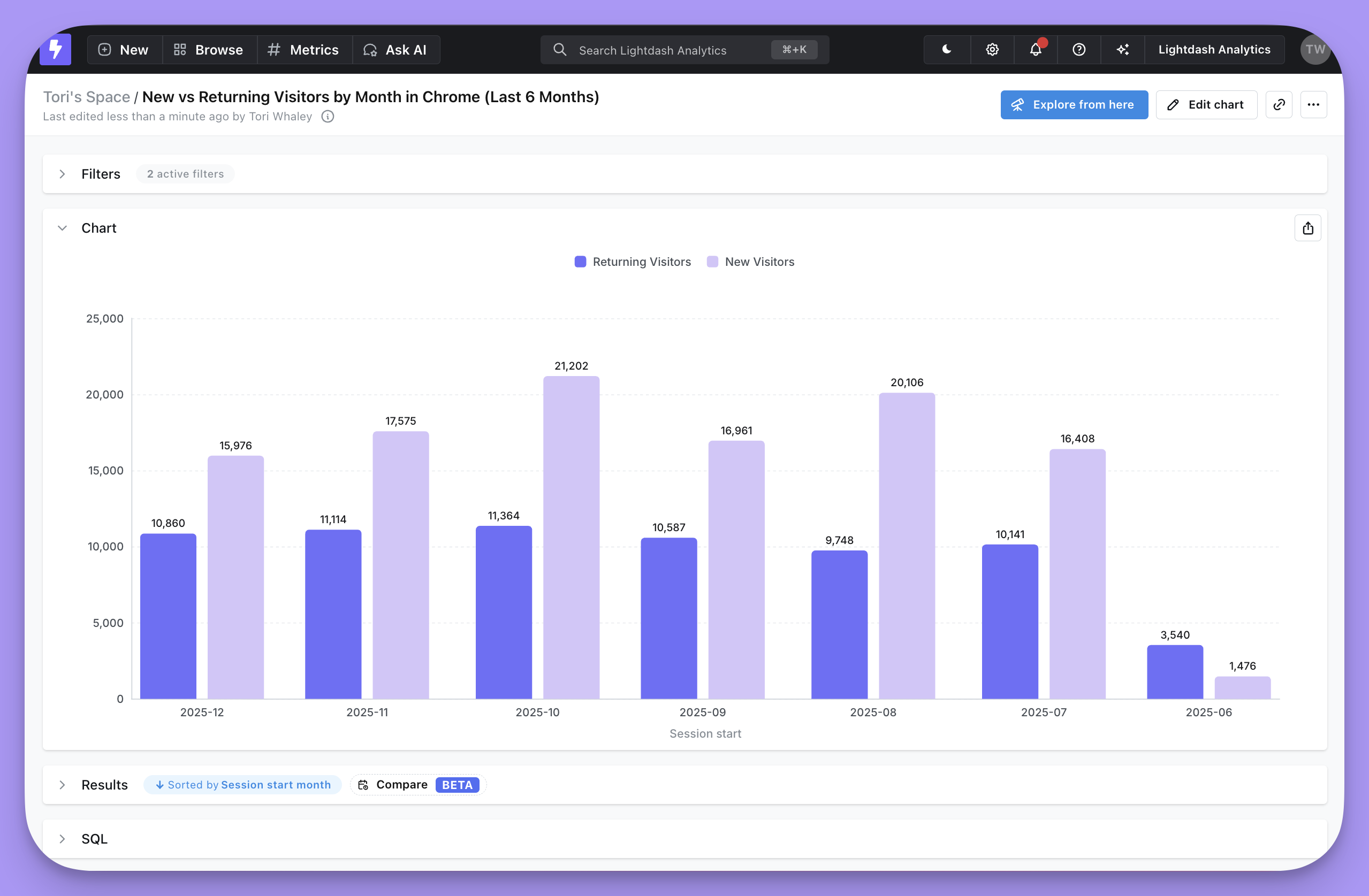 Saved Charts allow you to save a specific chart or table so you can share, add it to a dashboard, or revisit it again in future. When you open a saved chart, it will always update to display the latest data in your database since it will re-run the query each time you open it.