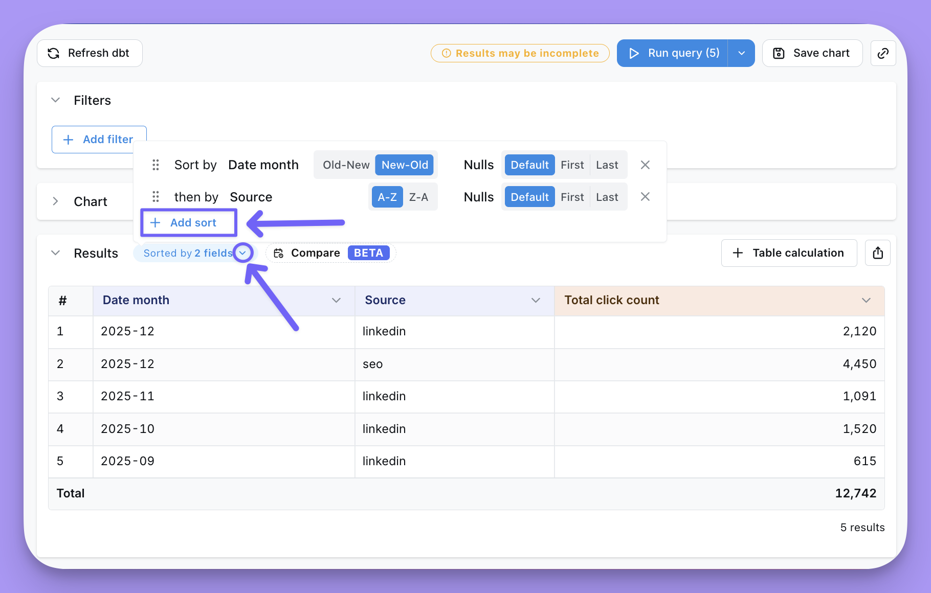 If you want to sort by multiple fields, click the blue pill that displays the current sort, then choose + Add sort.