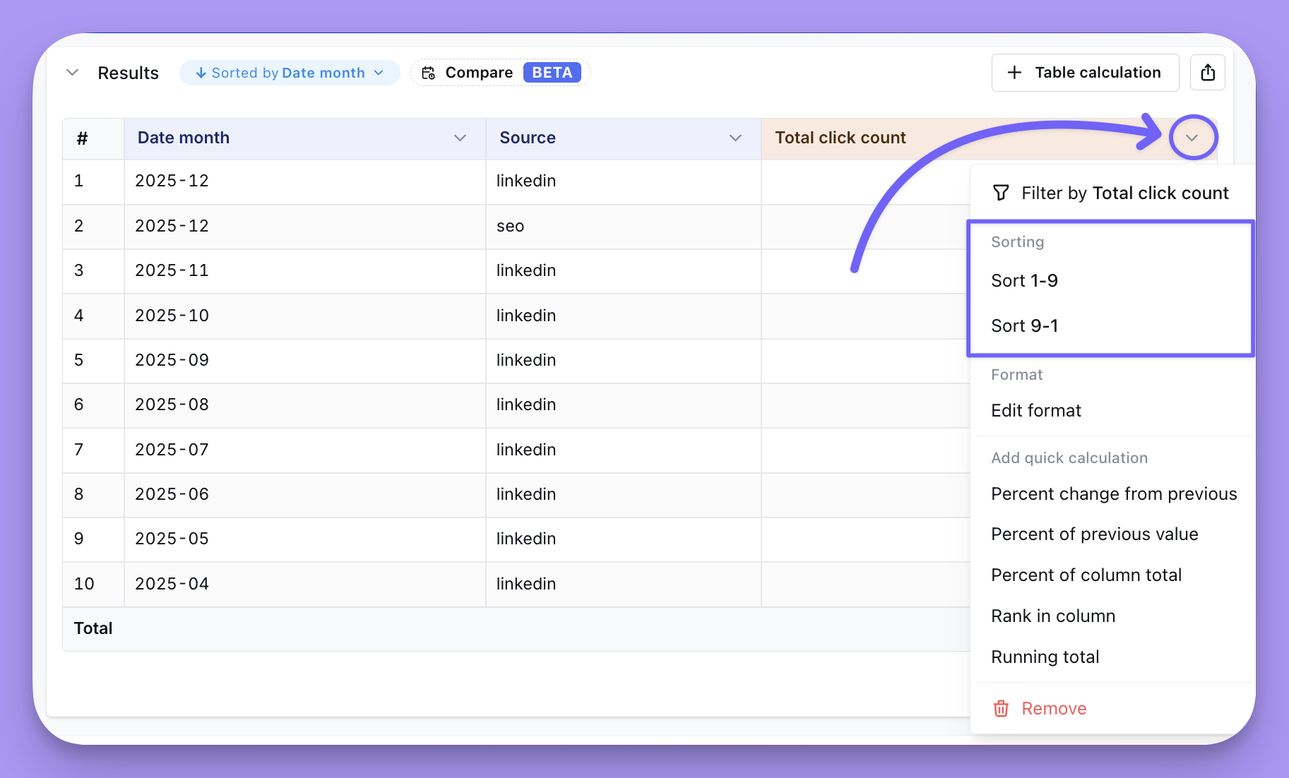 4. Change the order of a column’s sort using the toggle next to the field name in the sort menu.