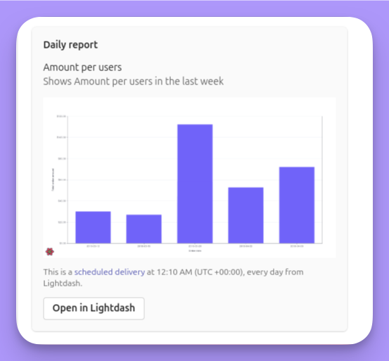 Emailed scheduled deliveries are available on all Lightdash Cloud plans. To set up Slack, an organization admin will have to add the Slack integration.Creating a scheduled delivery