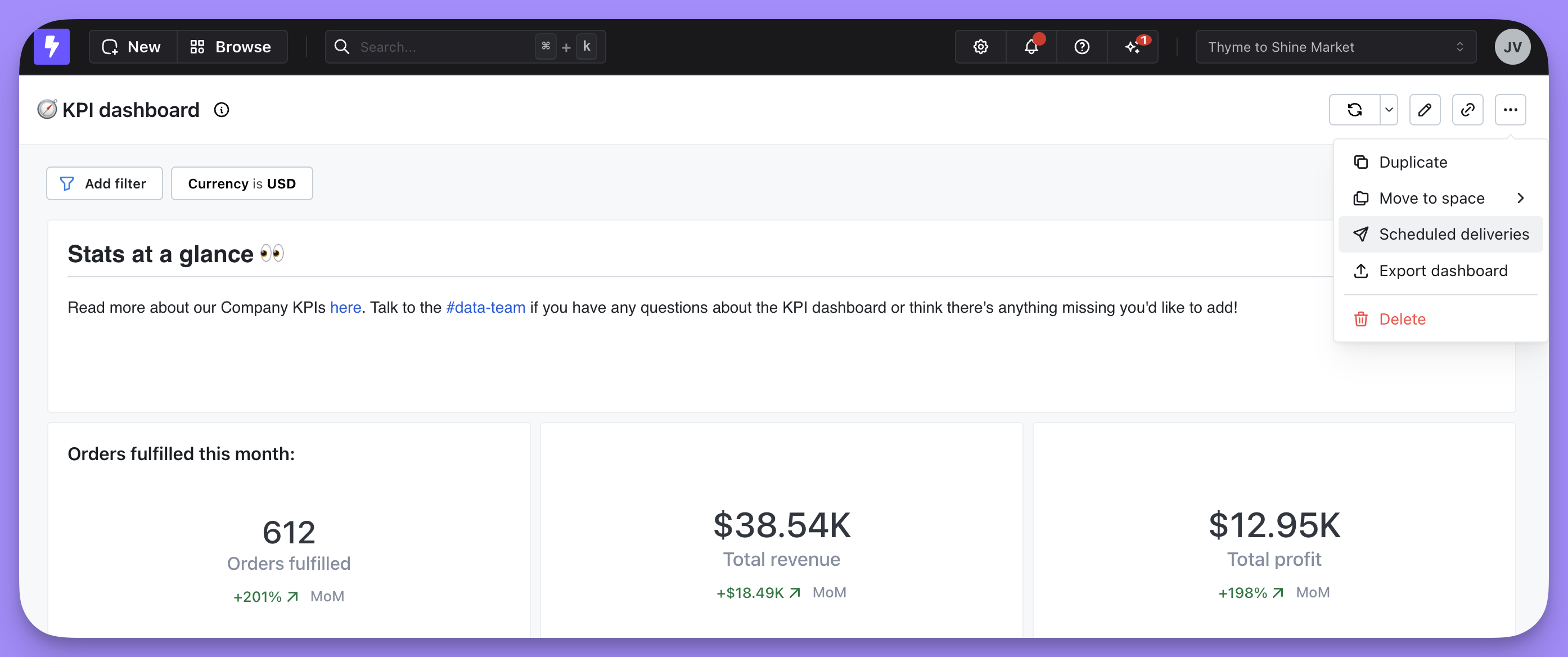 You can choose if you want to send your scheduled delivery to Slack, email, or both. You can add as many Slack channels and email addresses as you’d like to here. You can send a scheduled delivery to a person in Slack using@persons-name or to a channel using #channel-name.